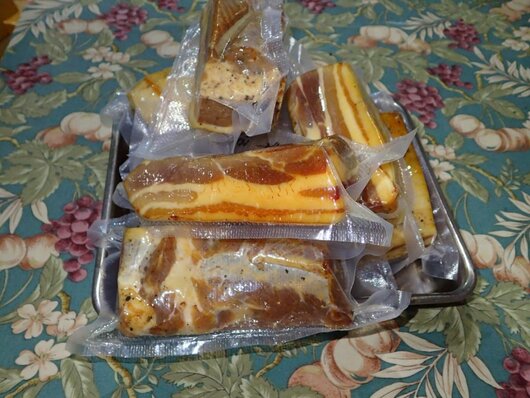 昨日は、3キロのベーコン用豚バラをソミュール漬けにして2週間目でした。塩抜きをし、水気を拭いたものを風乾にしておき、今晩のお客様の夕食の仕込みを縫って、今、燻煙にかけているところです。  普通は温燻でベーコンを作りますが、私は冷燻で作ります。冷燻にかけて置き、真空パックにして1日休ませます。そのまま冷凍にし、食すときに60℃の低温で3時間ボイルして完成。この作り方のほうが、しっとりして角の無い、豚肉本来の味わい深いベーコンを楽しめます。  一度に沢山食べることはありませんが、厚切りにした暖かく柔らかいベーコンは、お酒に良く合います。ストーブの前で薪のはぜる音を聞きながら、ナイフでカッとしつつ味わうのは、樽の香りが良くするウィスキーが合うのかな?(♥◠‿◠)ノ